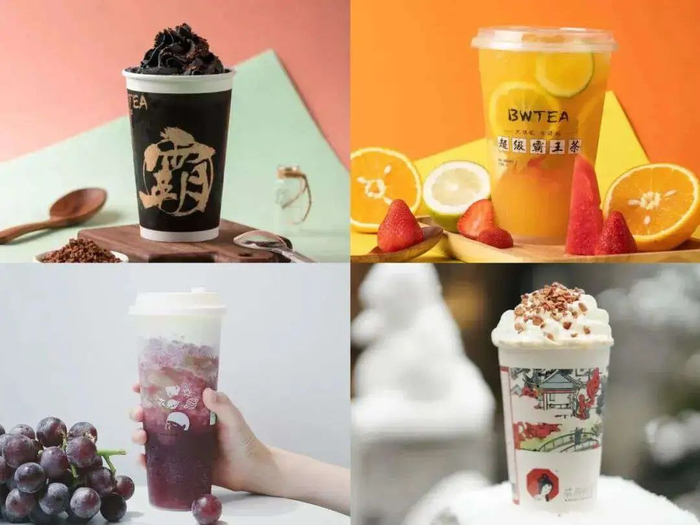 早年的霸王茶姬饮品广泛借鉴同行,不仅卖奶茶、芝士奶盖茶,也卖水果茶、芋泥茶和纯茶等,种类达49款。种类虽多,但都以视觉噱头为卖点,比如:一款黑色奶油顶的产品,被一些网友称为“黑暗料理”;1升的杯子里装满了西瓜、橙子、草莓等5种应季水果,这款水果茶的卖点是“拍照显脸小”。