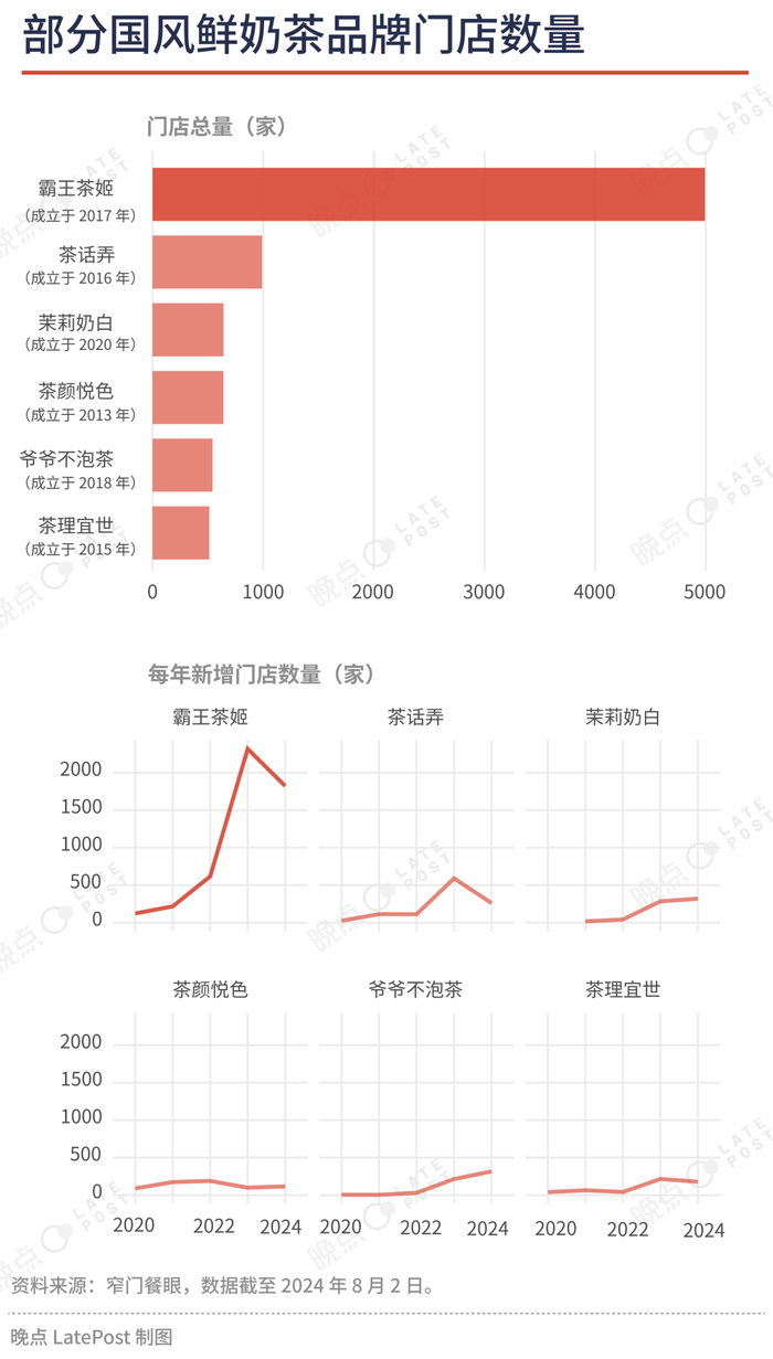 一位接近霸王茶姬的投资人透露,这个目标背后既有投资人给的压力,也因为张俊杰受到了茶百道创始人王霄锟的影响。茶百道自创立以来,用了十二年时间才将门店数拓展至1000家。然而2020年,它却只用了四个月便将门店数拉升至2000家,这给了他极大的信心。