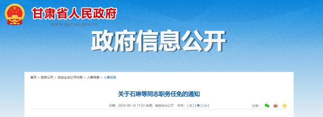 8月14日,甘肃省人民政府发布《关于石琳等同志职务任免的通知》,任命工作人员共涉及11所高校。