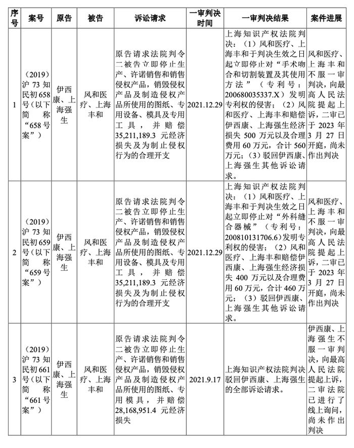 风和医疗招股说明书称,强生和公司分别于2021年10月和2022年1月对各自败诉的案件向最高人民法院提起上诉,其中强生针对(2019)沪73知民初660号提起的上诉已撤诉。截至本招股说明书签署日,(2019)沪73 知民初658号、(2019)沪73 知民初659号和(2019)沪73 知民初661号案件尚未作出二审判决,公司仍有三项未决诉讼。