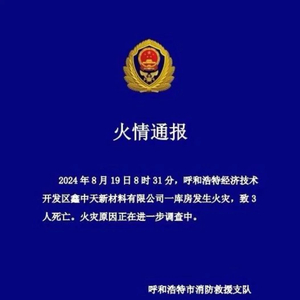 据内蒙古自治区呼和浩特市消防救援支队消息,2024年8月19日8时31分,呼和浩特经济技术开发区鑫中天新材料有限公司一库房发生火灾,致3人死亡。火灾原因正在进一步调查中。