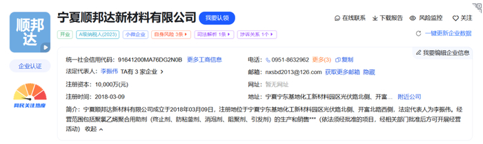 据爱企查显示,宁夏顺邦达新材料有限公司注册资本1亿元,注册地位于宁夏宁东基地化工新材料园区光伏路北侧、开富北路西侧,法定代表人为李振伟。经营范围包括聚氯乙烯聚合用助剂(终止剂、防粘釜剂、消泡剂、阻聚剂、引发剂)的生产和销售。