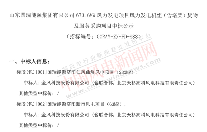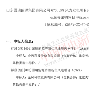 中国风电新闻网讯:8月19日,山东国瑞能源集团有限公司国瑞能源济阳仁风曲堤风电项目(282MW)和国瑞能源济阳新市风电项目(63MW)风力发电机组(含塔架)货物及服务采购项目中标公示,规模共计345MW,金风科技与北京天杉高科风电科技有限责任公司联合体中标。