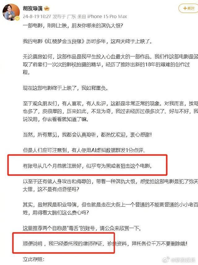 称该片是她平生投入心血最大的一部作品,“这部电影是汲取了前辈们一次次的影视拍摄的精华,经历了推陈出新的18年的艰难的创作过程。”她欢迎并感谢所有意见,但也注意到“有人使用AI虚拟数据群发1分点评”,有些账号似乎蓄意狙击该电影,甚至进行人身攻击,对此,她表示已委托律师存证。