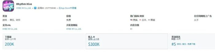 《Rhythm Hive》虽然已经推出3年,但根据Sensor Tower最新数据显示,该游戏在韩国、日本、美国等K-Pop热门地区的App Store最近一个月仍有20万次的下载量和30万美元的收入。在App Store韩国区域“游戏/音乐/免费下载”类别中,这款游戏排在第5位。