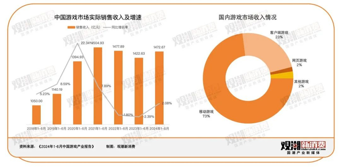 2020年,移动游戏在中国游戏市场上的收入占比约为75%,到了2024年上半年,占比依然高达73%。