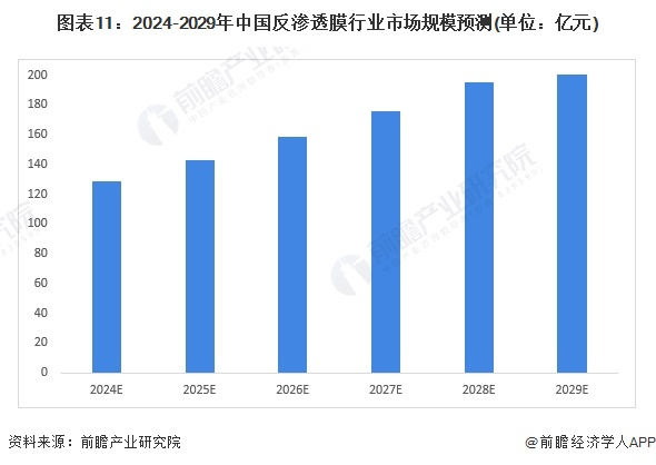 当今世界正经历百年未有之大变局,我国正在构建以国内大循环为主体、国内国际双循环相互促进的新发展格局,膜行业正处于国际供应链体系重建、国内进口替代加速的阶段,为反渗透膜行业带来较好的发展机遇和广阔的市场空间。根据中国膜工业协会发布的《2021-2022中国膜产业发展报告》,2025年,我国膜产业产值有望达到5000亿元,据此得出,2022-2025年中国膜产总产值年复合增长率约为11.57%。反渗透膜作为我国膜材料中重要产品之一,发展前景与膜产业趋同,故前瞻取11%的增长率对中国反渗透膜行业市场规模进行预测,到2029年,中国反渗透膜行业市场规模预计将突破200亿元。