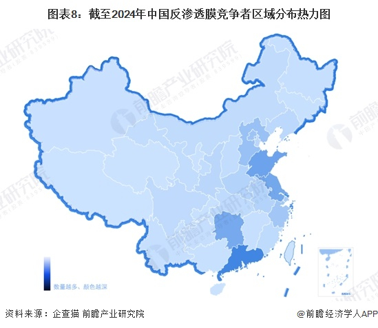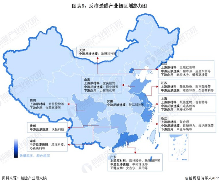 从产业链代表性企业分布情况来看,沿海地区企业分布较密集。北京、上海、浙江和广东等地企业产业链布局完善,全产业链均有代表企业。如浙江地区上游原材料聚酰胺生产企业聚合顺,反渗透膜厂商日新恒力,下游有海水淡化处理企业中金环境等。
