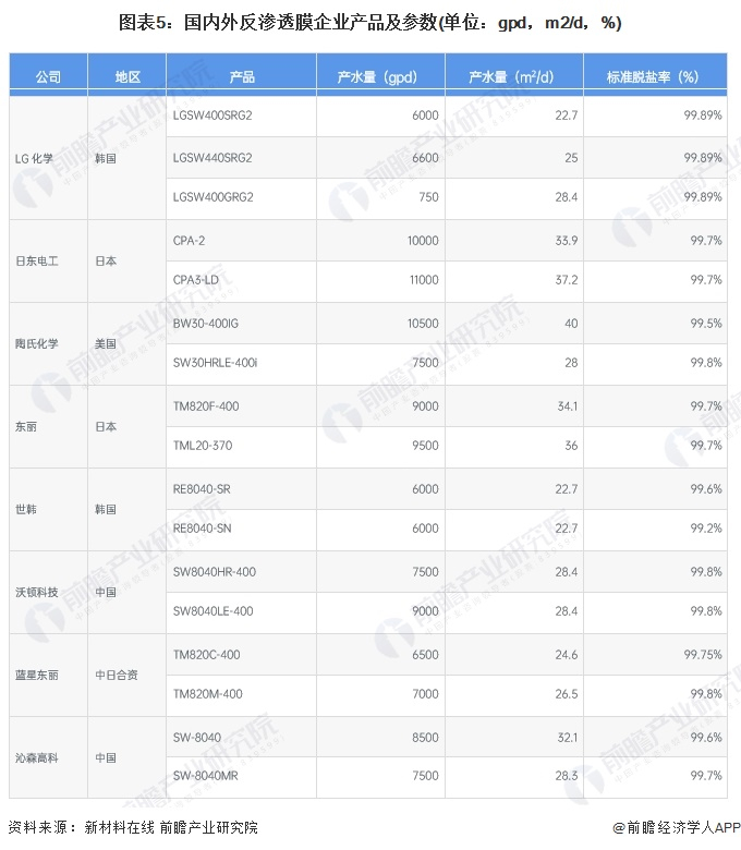 下图对比了国内外企业的反渗透膜产品的性能,在产水量方面日东电工和陶氏化学表现最好,在标准脱盐率方面LG化学产品处于领先地位,具体如下: