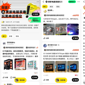 此外,在闲鱼海鲜市场栏目,用户自发建立起#更新电脑装备玩黑神话悟空#的话题,除了相关商品的转卖与租赁,不少网友发帖提供 “DIY电脑升级咨询”“装机配置推荐”的服务,借着游戏上线热度做起专业知识变现生意。