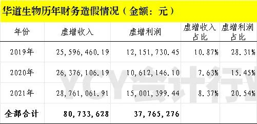 2020年至2021年通过向湖北迪美科技有限公司、吉林省达之明经贸有限公司、江苏福特宏晔化工有限公司、金溪县云祥药业有限公司、辽宁天一农药化工有限责任公司、内蒙古世杰化工有限责任公司、内蒙古众合化工仓储有限公司、寿光诺盟化工有限公司、长春市新傲实业有限公司、宁夏顺邦达化工有限公司、镇江创力化工有限公司共11家客户虚开发票,并通过华道生物控制的关联方及其他公司和个人银行账户制造销售回款方式,虚增2020年销售收入26,376,106.19元,占披露的当年销售收入的7.63%,虚增利润总额10,612,146.10元,占披露的当年利润总额的15.45%;虚增2021年销售收入28,761,061.91元,占披露的当年销售收入的8.37%,虚增利润总额15,001,399.44元,占披露的当年利润总额的20.54%。