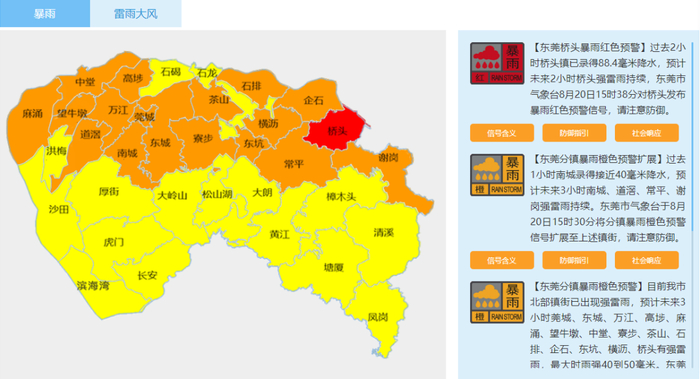 【东莞分镇暴雨橙色预警扩展】过去1小时南城录得接近40毫米降水,预计未来3小时南城、道滘、常平、谢岗强雷雨持续。东莞市气象台于8月20日15时30分将分镇暴雨橙色预警信号扩展至上述镇街,请注意防御。