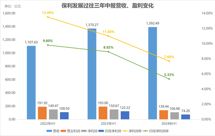 2024年上半年,保利发展录得营业收入1392.5亿元,同比增长1.66%;归母净利润74.2亿元,同比下降39.3%;扣非归母净利润72.3亿元,同比下降38.35%。