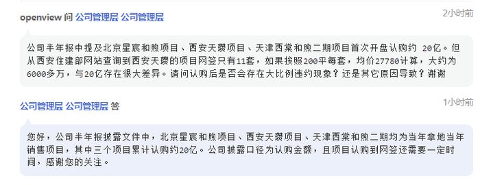 但上述3个项目销售情况遭到了投资人的质疑。保利发展则解释称,“北京星宸和煦项目、西安天瓒项目、天津西棠和煦二期均为当年拿地当年销售项目,其中三个项目累计认购约20亿。公司披露口径为认购金额,且项目认购到网签还需要一定时间。”
