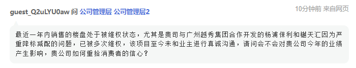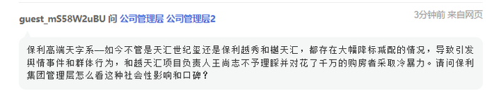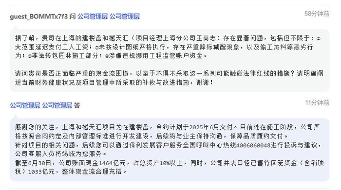 对此,保利发展管理层回应称,“上海和樾天汇项目为在建楼盘,合约计划于2025年6月交付。目前处在施工阶段,公司严格按照合同约定及内部管理标准进行开发建设,后续将与业主保持沟通,保障品质履约交付”。