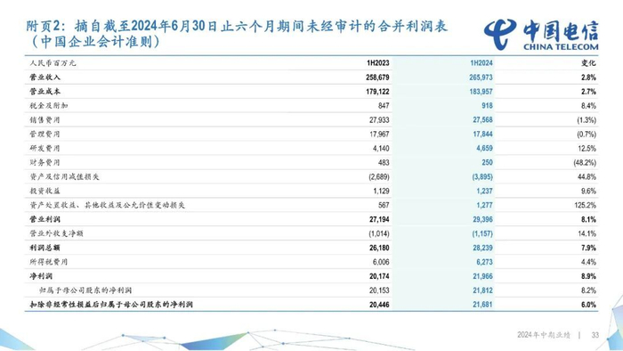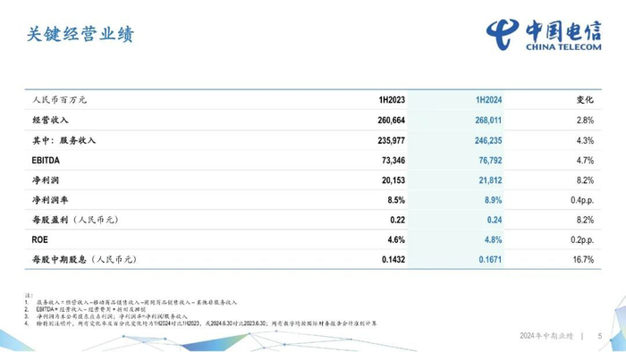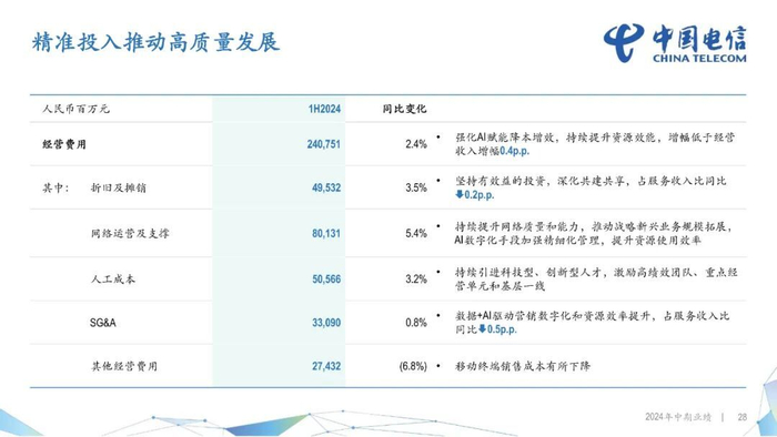 在半年报中,中国电信对相关财务指标变动做出了说明。上半年,中国电信营业成本为1839.6亿元,较去年同期增长2.7%,主要原因是中国电信加大产业数字化、智慧家庭等高增长业务的投入。同时,强化AI赋能降本增效,持续提升资源效能,支撑企业高质量发展及长期价值创造。