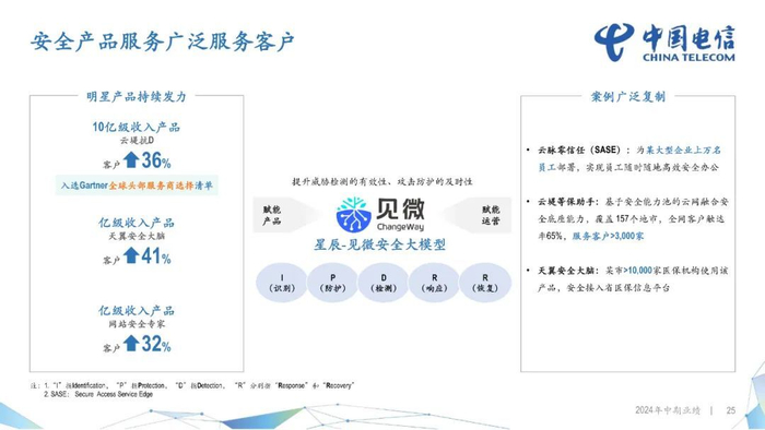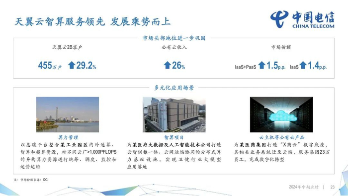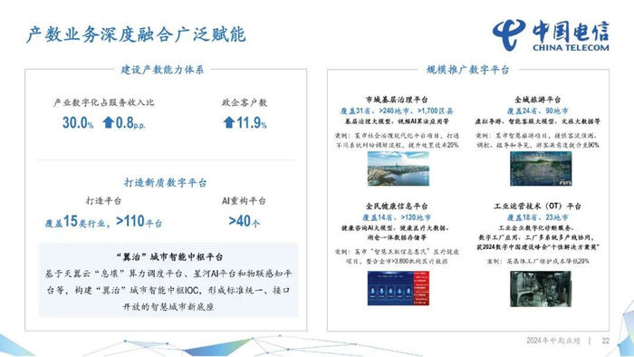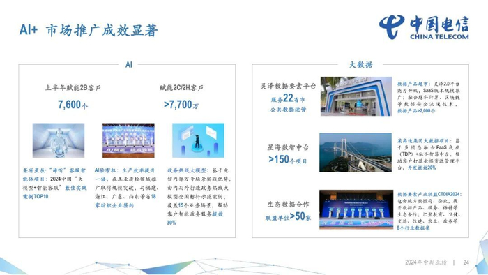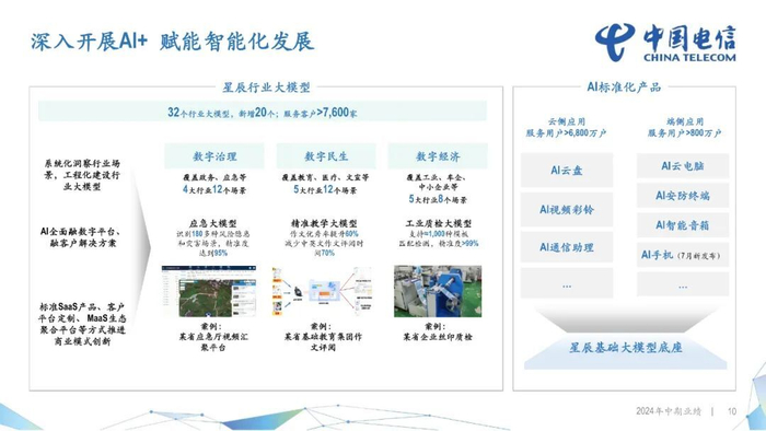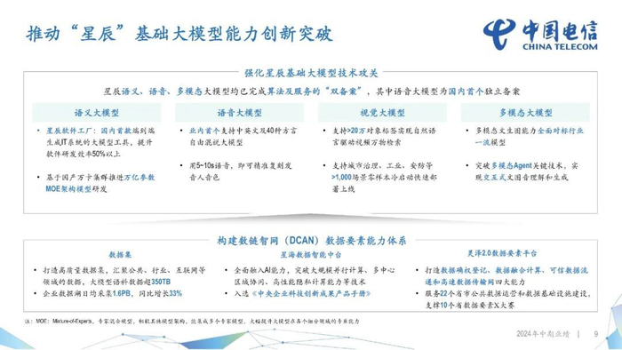 智算云底座方面,构建领先的“息壤”一体化智算服务能力,提供极致的算力调度服务、高效的一体化计算加速服务、普惠的一站式智算服务以及繁荣的模型应用生态,层次化推进自有智能算力布局,“息壤”已接入39家算力合作伙伴各类智能算力合计22EFLOPS,天翼云全面升级产品及生态矩阵,迈入智能云的新发展阶段。通用大模型底座方面,不断提升基础大模型能力,星辰系列语义、语音、多模态大模型均已完成算法及服务的“双备案”,其中星辰语音大模型为国内首个独立备案的语音大模型,发布国内首款一键生成代码及自主测试纠错的AI开发工具星辰·软件工厂,积极通过开源推动大模型技术进步,在央企中率先开源十亿、百亿、万亿多参数量级语义大模型。公司面向工业、教育、医疗、政务等领域推出32个行业大模型,赋能370个2B项目,推出AI手机、AI云电脑、AI大模型一体机等AI标准化产品,满足客户的多元化智能化需求;针对客服、网运、办公等企业运营环节推出10个内部大模型,数字人客服智能语音服务比例稳步提升,AI赋能基站和机房智慧节能成效不断显现。数据底座方面,发布“数链智网(DCAN)”能力体系,打造汇聚公共、行业、互联网等领域数据的高质量数据集,构建星海数据智能中台,赋能150余个政企客户项目,升级灵泽2.0数据要素平台,服务22个省市公共数据运营和数据基础设施建设,数据产品超市模式合作伙伴超1,300家,数据产品超2000个。