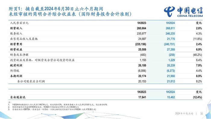 8月20日,中国电信公布上半年业绩。2024年上半年,中国电信营收净利实现双增长。营业收入2660亿元,同比增长2.8%,其中服务收入2462亿元,同比增长4.3%。归属于上市公司股东的净利润218亿元,同比增长8.2%,归属于上市公司股东的扣除非经常性损益的净利润217亿元,同比增长6.0%,基本每股收益0.24元。资本开支472亿元。