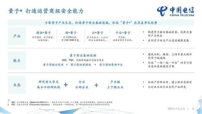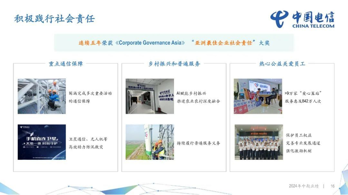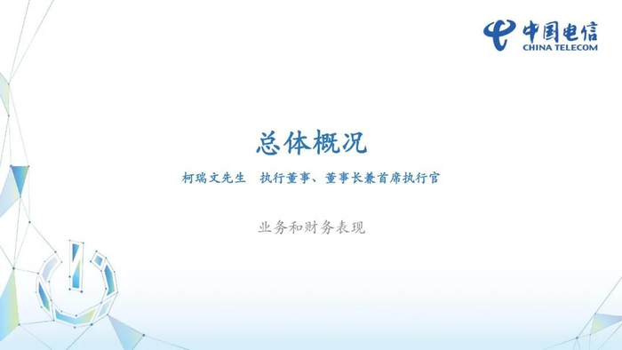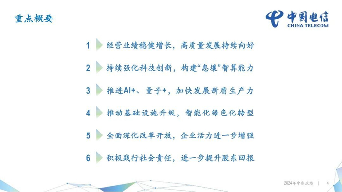 中国电信董事长柯瑞文在业绩说明会上表示:上半年中国电信经营业绩稳健增长,高质量发展持续向好;持续强化科技创新,构建“息壤”智算能力;推进A+、量子+,加快发展新质生产力;推动基础设施升级,智能化绿色化转型;全面深化改革开放,企业活力进一步增强;积极践行社会责任,进一步提升股东回报。