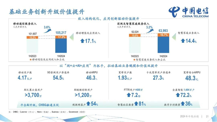 固网及智慧家庭服务收入达640亿元,同比增长3.2%,其中,智慧家庭业务收入达到107亿元,同比增长14.4%,宽带用户数净增319万户,达到1.93亿户,宽带综合ARPU达到48.3元。