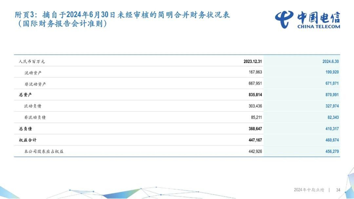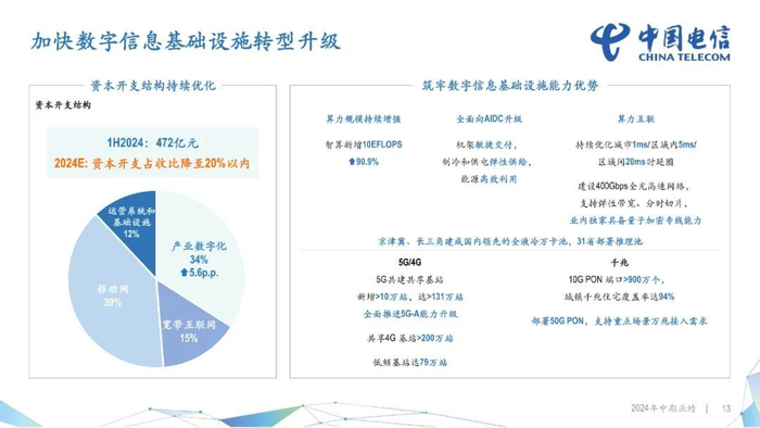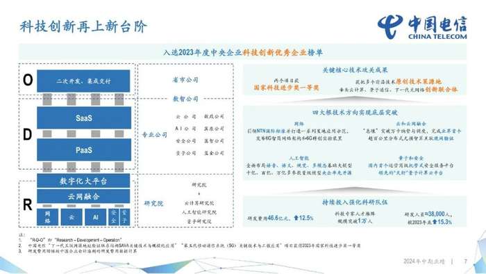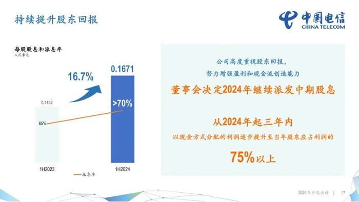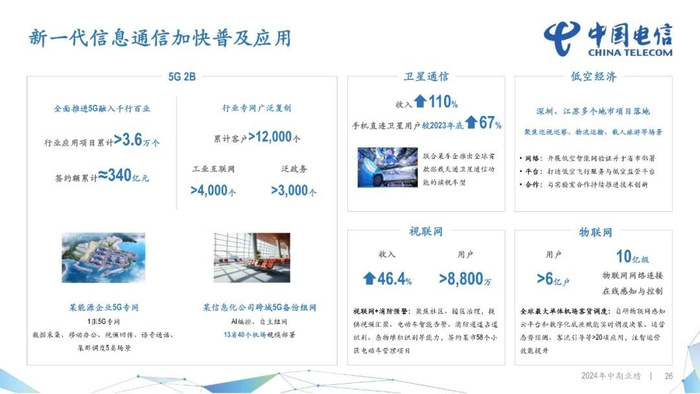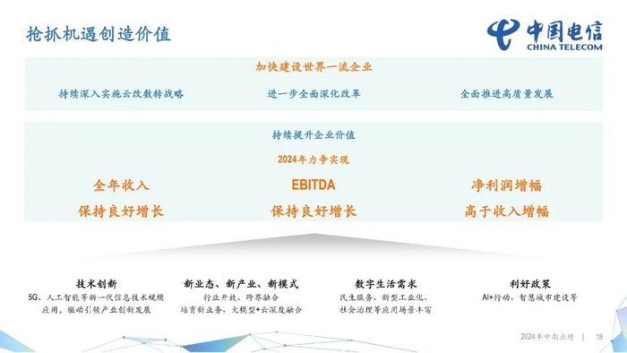 展望全年,中国电信提出2024年力争实现全年收入保持良好增长、EBITDA保持良好增长、净利润增幅高于收入增幅的发展目标。在技术创新方面,5G、人工智能等新一代信息技术规模应用,驱动引领产业创新发展;在新业态、新产业、新模式方面,行业开放、跨界融合,培育新业务、大模型+云深度融合;数字生活需求方面,民生服务、新型工业化、社会治理等应用场景丰富;利好政策方面,加速AI+行动、智慧城市建设等。