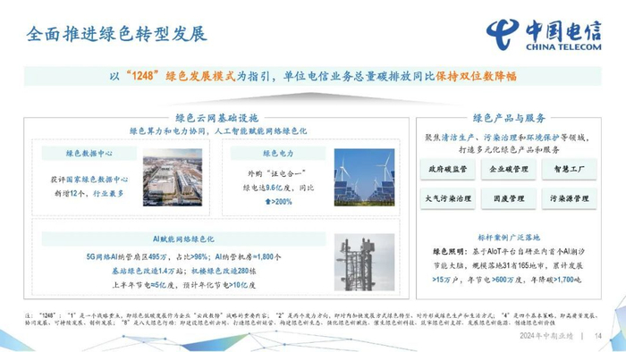 全面建设绿色数据中心,加快传统通信机楼绿色化改造,新增获评国家绿色数据中心12个,为行业最多。持续推动机房和基站AI智慧节能和绿色改造,5G/4G基站AI节能覆盖率达96%,累计覆盖约1800个机房和495万个扇区,基站绿色改造1.4万站,机楼绿色改造280栋,合计年化节电超10亿度。加大绿色电力引入,上半年新增“证电合一”绿电9.6亿度,同比增幅超200%。强化绿色产品与服务,聚焦清洁生产、污染治理和环境保护等领域,打造生态环境大数据平台、大气污染防治指挥调度系统及绿色照明等一系列绿色解决方案,赋能经济社会绿色低碳转型。
