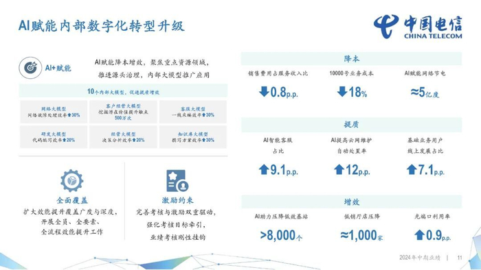 中国电信深入开展“AI+”,以“星辰”为品牌,完成“1+1+1+M+N”人工智能总体布局,加强各领域能力通融互促,持续丰富星辰大模型系列产品体系,赋能千行百业智能化转型,助力企业降本增效。
