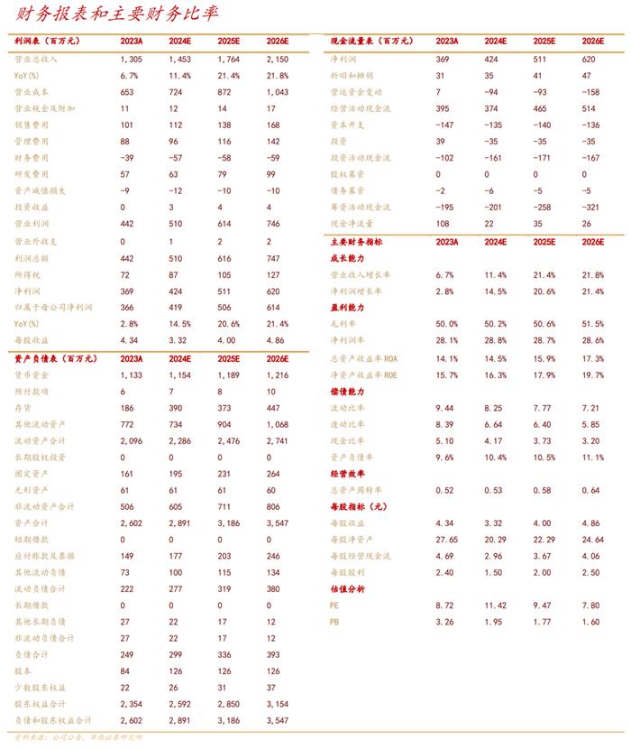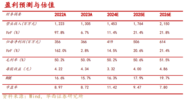 尽管仍有短期因素扰动,我们认为公司凭借持续研发创新投入下打造的高质产品有望在高景气,稳定的下游消费市场中脱颖而出,业绩将会持续向好的趋势不变,看好公司长期的发展前景。我们调整此前的盈利预测,将公司2024-2026年营收由16.52/20.70/25.61亿元分别调整为14.53/17.64/21.50亿元;将EPS 由5.71/7.11/8.72元分别调整为3.32/4.00/4.86元,对应2024年8月20日收盘价37.87元/股,PE分别为11/9/8倍,维持“买入”评级。