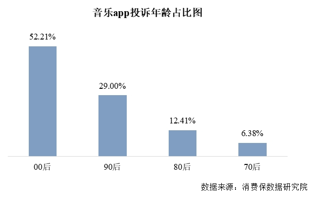 从音乐APP的投诉用户属性分析中发现,女性用户的投诉比例达到57.01%,男性用户投诉比例则为42.99%,性别比例相对均衡。在年龄分布上,00后用户成为投诉的主要群体,占比高达52.21%。90后用户次之,占投诉总量的29.00%,而80后和70后用户的投诉比例分别为12.41%和6.38%。