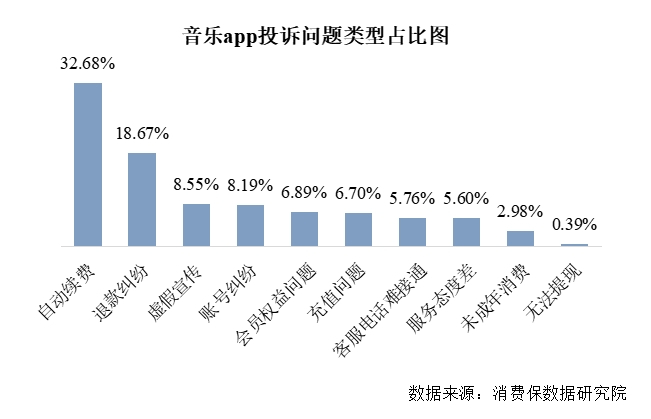 根据消费保受理的音乐APP有效投诉显示,自动续费问题以32.68%的比例占据投诉榜首位,其次是退款纠纷问题,占比18.67%。虚假宣传问题、账号纠纷问题和会员权益问题分别以8.55%、8.19%和6.89%的比例位列其后。除此之外,用户还反映了充值难题、客服难以接通、服务质量不佳、未成年人消费监管不力以及提现问题等其他问题。