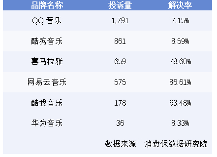 这些数据表明,音乐APP或多或少都存在用户在使用软件时遇到的共性问题,但投诉解决率所存在的明显差异,却反映出各平台在面对用户投诉时的响应速度和服务质量。