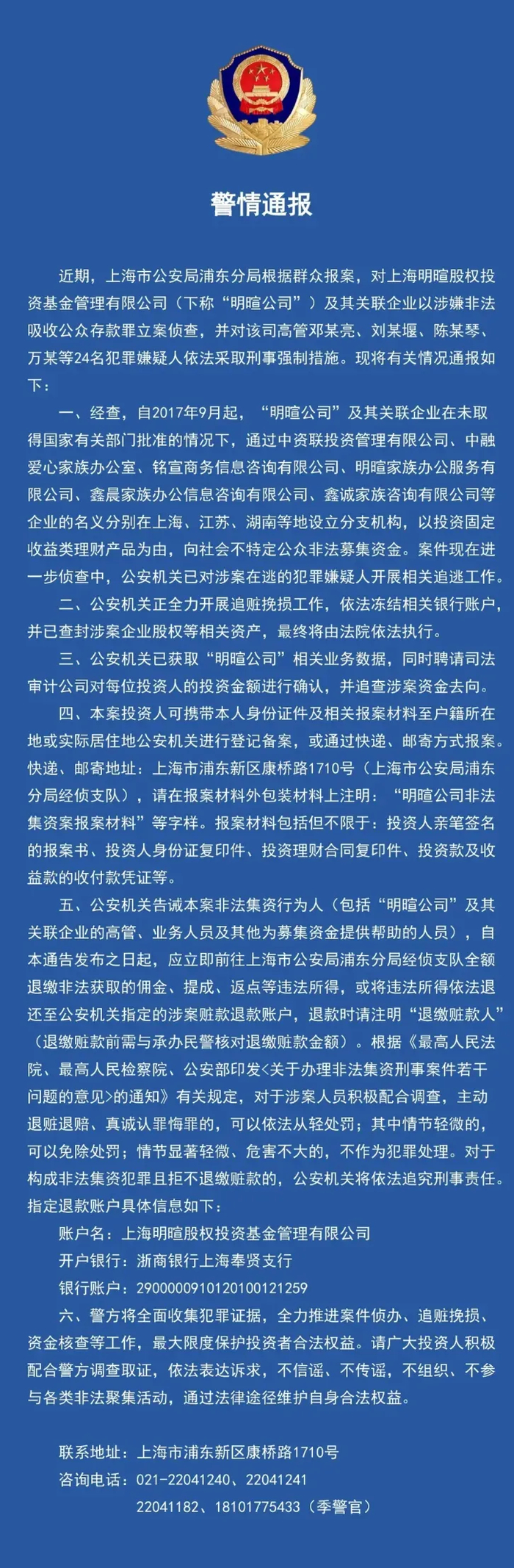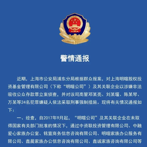 近期上海警方接到举报,上海明暄股权投资基金管理有限公司(下称“明暄公司”)及其关联企业以涉嫌非法吸收公众存款,警方对其相关行为进行调查。