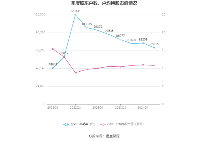 筹码集中度方面,截至2024年上半年末,公司股东总户数为7.6万户,较一季度末下降了6193户,降幅7.53%;户均持股市值由一季度末的11.00万元下降至10.85万元,降幅为1.36%。