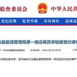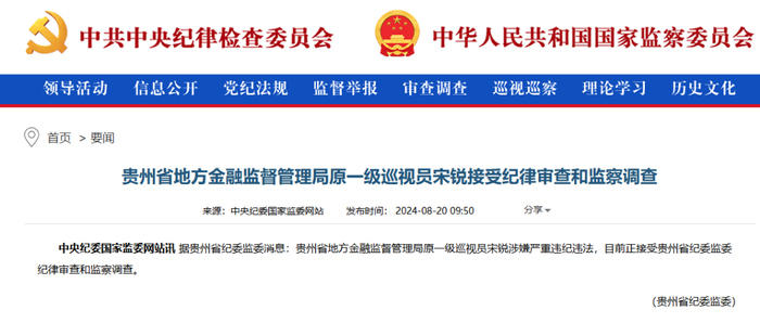 8月20日,中央纪委国家监委官网通报,贵州省地方金融监督管理局原一级巡视员宋锐涉嫌严重违纪违法,目前正接受贵州省纪委监委纪律审查和监察调查。