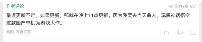 甚至还有网文作者称要因为玩游戏而断更,“最近更新不定,因为我要去当天命人,玩《黑神话:悟空》。”
