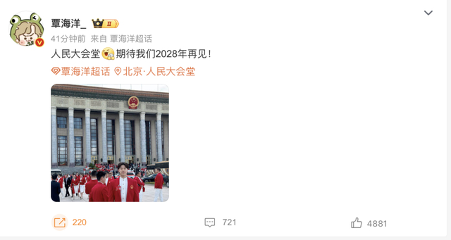 覃海洋:“人民大会堂,期待我们2028年再见!”