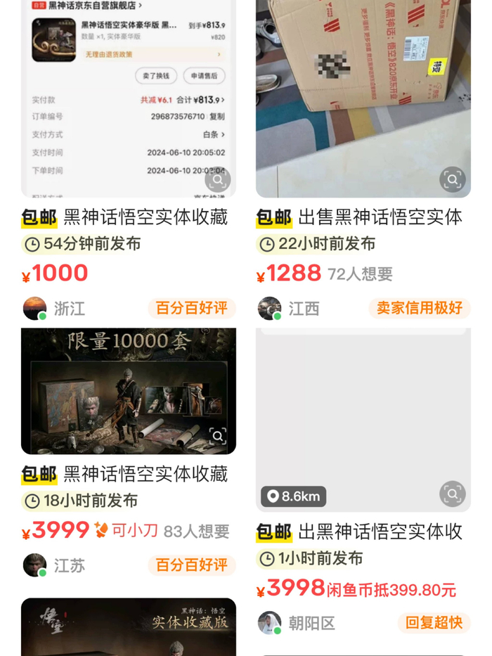 在二手交易平台上,价值820元的实体豪华版售价超过1200元,价值1998元的实体收藏版更是被炒到了近4000元,溢价100%。