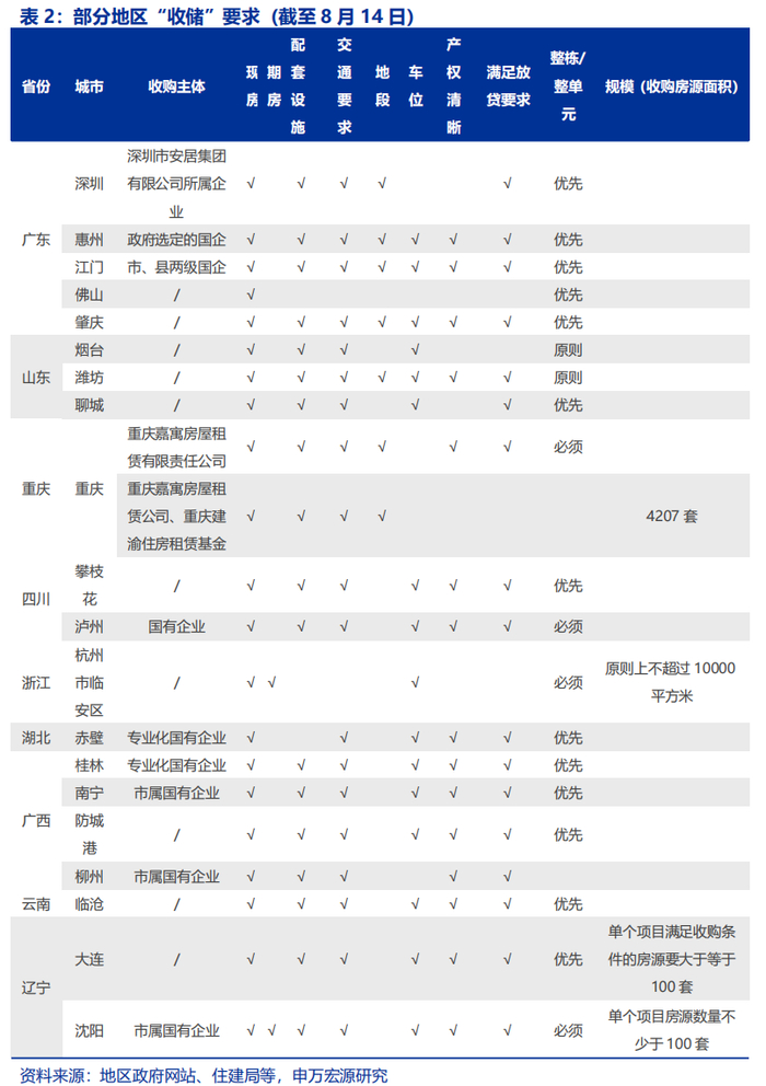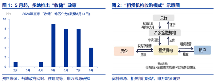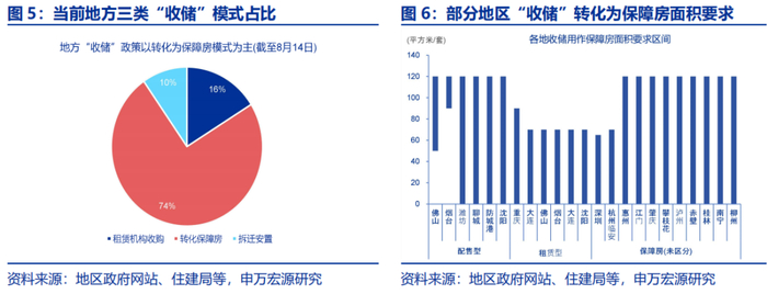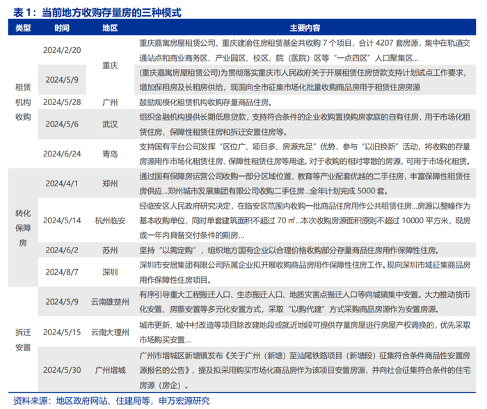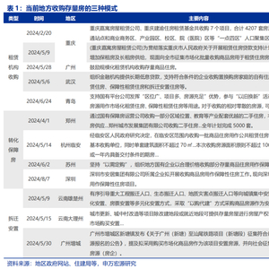 5月以来,地方“收储”工作加速推进,多个地区出台“收储”相关政策,通过转化为保障房、租赁机构收购、以及拆迁安置等模式收购存量住房。“租赁机构收购模式”为市场化租赁机构收购存量商品房用于增加租赁住房房源;“转化保障房模式”为收购存量新建商品房或二手房,用保障房等;“拆迁安置模式”为拆迁安置项目,通过购买存量商品房代替拆迁安置房建设。