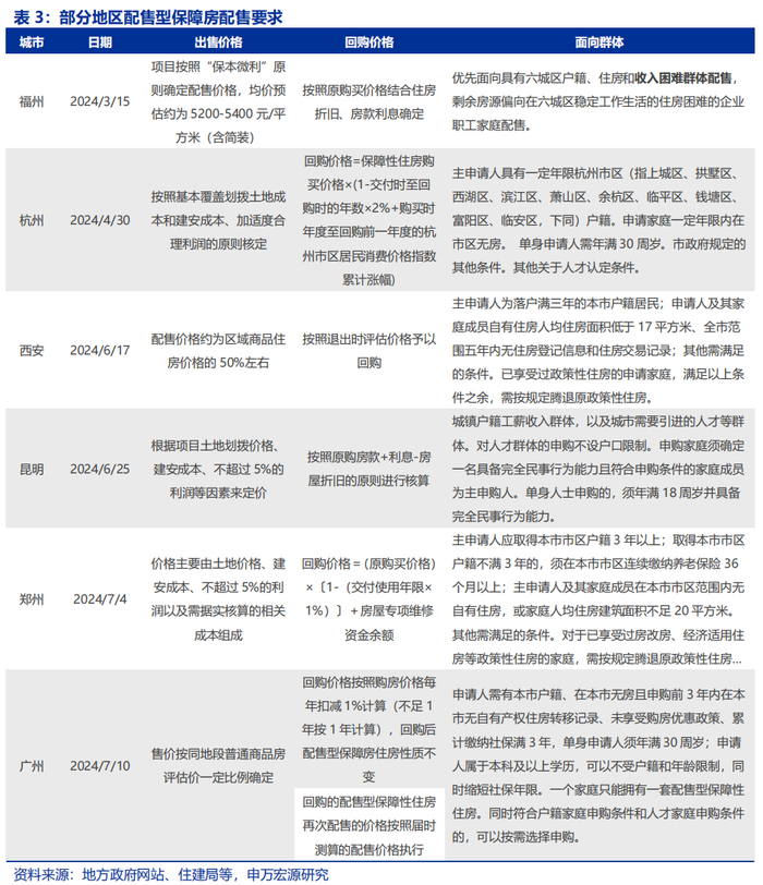 当前,部分地区已推出配售型保障房申请机制,出售价格为“保本微利”,回收价格考虑通胀、折旧等因素。3月以来,福州、杭州、西安等地陆续推出配售型保障房申请方案;配售价格均按照“保本微利”原则,多地提出按照基本覆盖划拨土地成本和建安成本、加适度合理利润(例如不超过5%)核定;回购价格则在购房价款基础上通常考虑房屋折旧、房款利息等因素;可申请对象主要为无自有住房或人均面积较低的当地家庭及单身居民,部分地区优先面向收入困难群体。