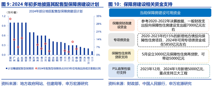 保障房再贷款、专项债等资金支持下,部分地区或可通过“收储”加快完成配售型保障房筹集目标。2024年初,多地年度配售型保障房筹集目标设定不低、可比口径下占2023年住宅商品房成交套数比例达10%;北京、上海、广州、深圳2024年配售型保障房筹集目标均为一万套,占2023年商品房住宅比例分别为15%、7%、14%、33%。考虑到部分地区配售型保障房筹集目标不低,且当前保障房建设具备财政资金、专项债资金、保障性住房再贷款和政策性银行等支持,地方“以购代建”的“收储”政策在加快完成配售型保障房筹集目标的同时,亦可缓解新房“库存”压力。