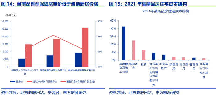 若“收储”价格明显低于地产项目投资成本,更大力度“收储”或主要有助于缓解房企债务压力。部分地区公布的配售型保障房申请方案显示,其配售单价为当地新建商品住宅(以2024年8月当地新建商品住宅均价为例)的40%及以下。拆分2021年某商品住宅项目成本结构,相比保障房建设的土地划拨、税收优惠、直接配售、融资支持等成本优势,商品住宅项目的楼面地价、销售费用、财务费用、行政性事业收费及税费等成本或相对更高。若地方“收储”价格普遍以保障房重置成本为上限,更大力度“收储”支持或主要有助于缓解房企偿债压力。