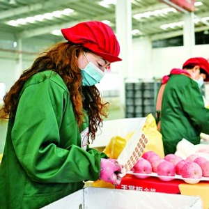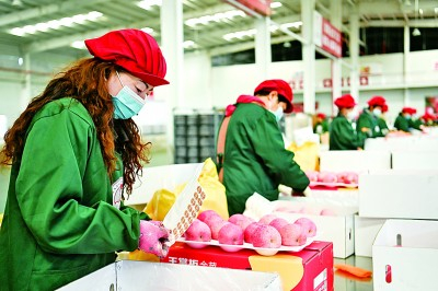 一家果业企业的工作人员在为洛川苹果贴标。新华社发