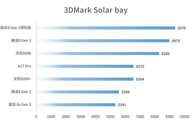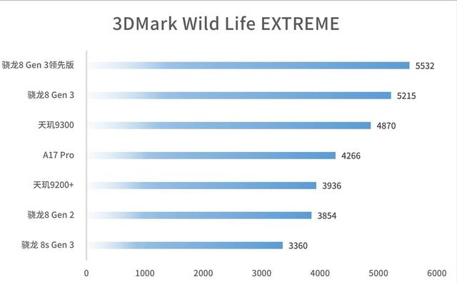 GPU方面可以说是骁龙8 Gen 3领先版的强项,骁龙8 Gen 3领先版的3DMark Solar bay得分为9376分,3DMark Wild Life EXTREME得分为5532分,傲视群雄。