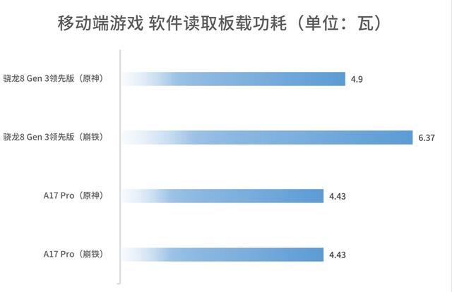 在大家更关心的功耗方面,我们分别测试了三款游戏,在原神中骁龙8 Gen 3领先版的软件读取功耗是4.9W;崩铁中软件读取功耗是6.37W;永劫无间跑图和战斗场景下,功耗分别是5.72W和4.58W,相比A17 Pro会高一些。