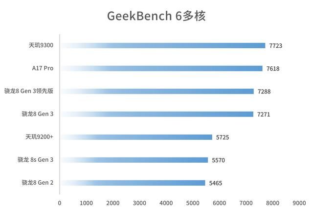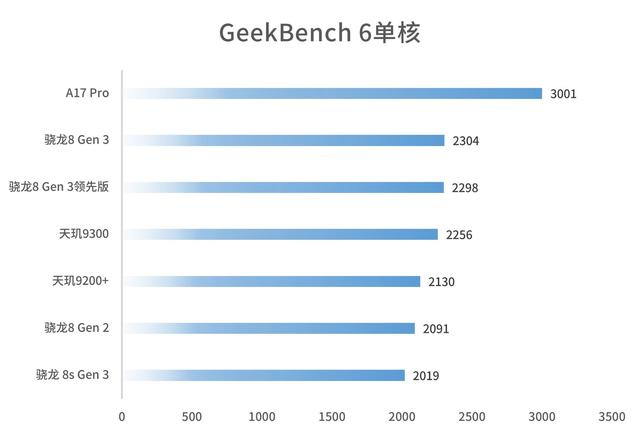 接下来在我们的老朋友,反应CPU性能的GeekBench 6测试中,骁龙8 Gen 3领先版单核得分为2298分,多核为7288分,相比此前有所提升,但是依旧不如全大核架构的天玑9300并逊色于iPhone 15 Pro所搭载的A17 Pro。