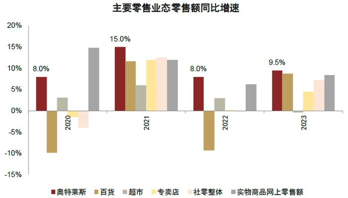 注:奥特莱斯销售额采用奥特莱斯产业发展委员会估计数据。 资料来源:奥特莱斯产业发展委员会,国家统计局,中金公司研究部