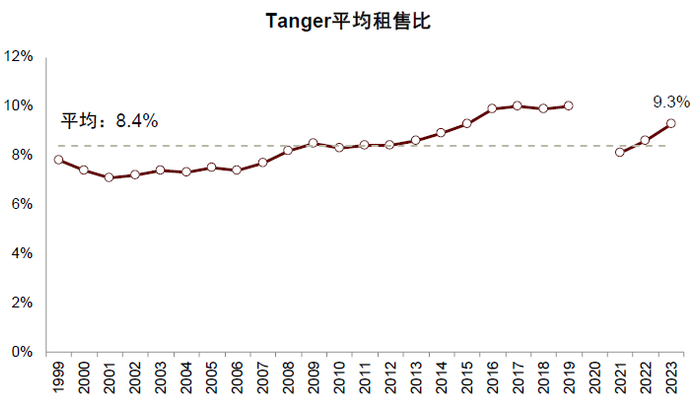 ► 租售比方面,1999-2019年Tanger的租售比由7.8%稳步抬升至10.0%左右,且2008年前后金融危机期间上涨节奏亦未被打断。