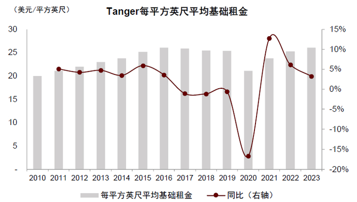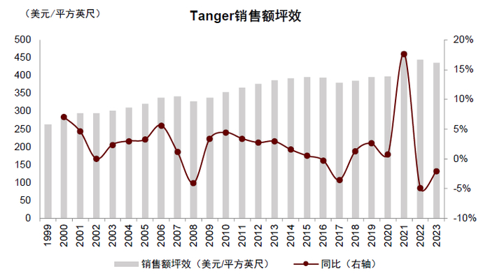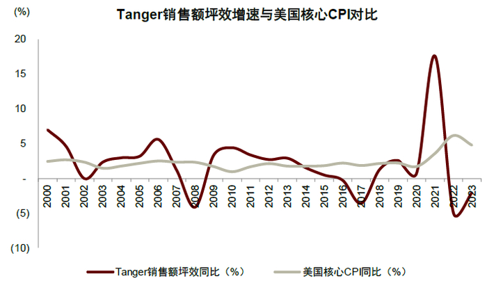 ► 销售额端:2000-2023年Tanger销售额坪效平均年化同比增速2.2%,该水平基本跑平同期美国核心CPI(2.3%)。