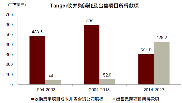 ► 1981-1995年:初创后的快速扩张。1981年,原本从事衬衫直营的Stanley K. Tanger打造首家Tanger Outlet,开始进入奥特莱斯市场;1980年中后期到1990年代初,Tanger体量快速扩张,如1992当年其总在管面积同比增长50%、达150万平方英尺(约14万平米);1993年,一方面为缓解债务融资压力、另一方面亦为继续顺周期扩张补充资本金,Tanger于纽交所上市、募资1.04亿美元,成为首家上市的奥莱REIT;上市次年其开工建设面积超过100万平方英尺,并以2,380万美元完成其首单收并购。