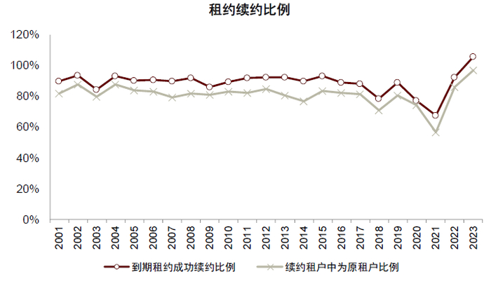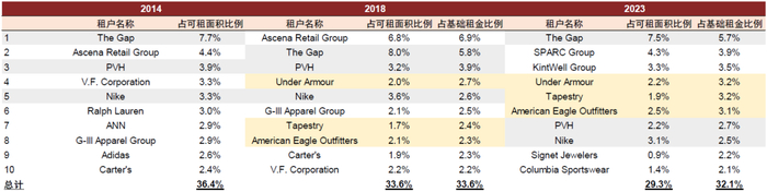 ► 出租率方面,疫情前Tanger出租率常年稳定在95%以上、随经济周期波动的幅度十分有限,我们统计Tanger每年有9成左右到期租约能够实现当年内成功续约,而续约租户中有约8成为原租户。从另一个角度看,观察Tanger在2014、2018和2023年的前10大租户统计,发现其中3个租户在10年间均位居前10、而近5年前10大租户重合度达到60%。